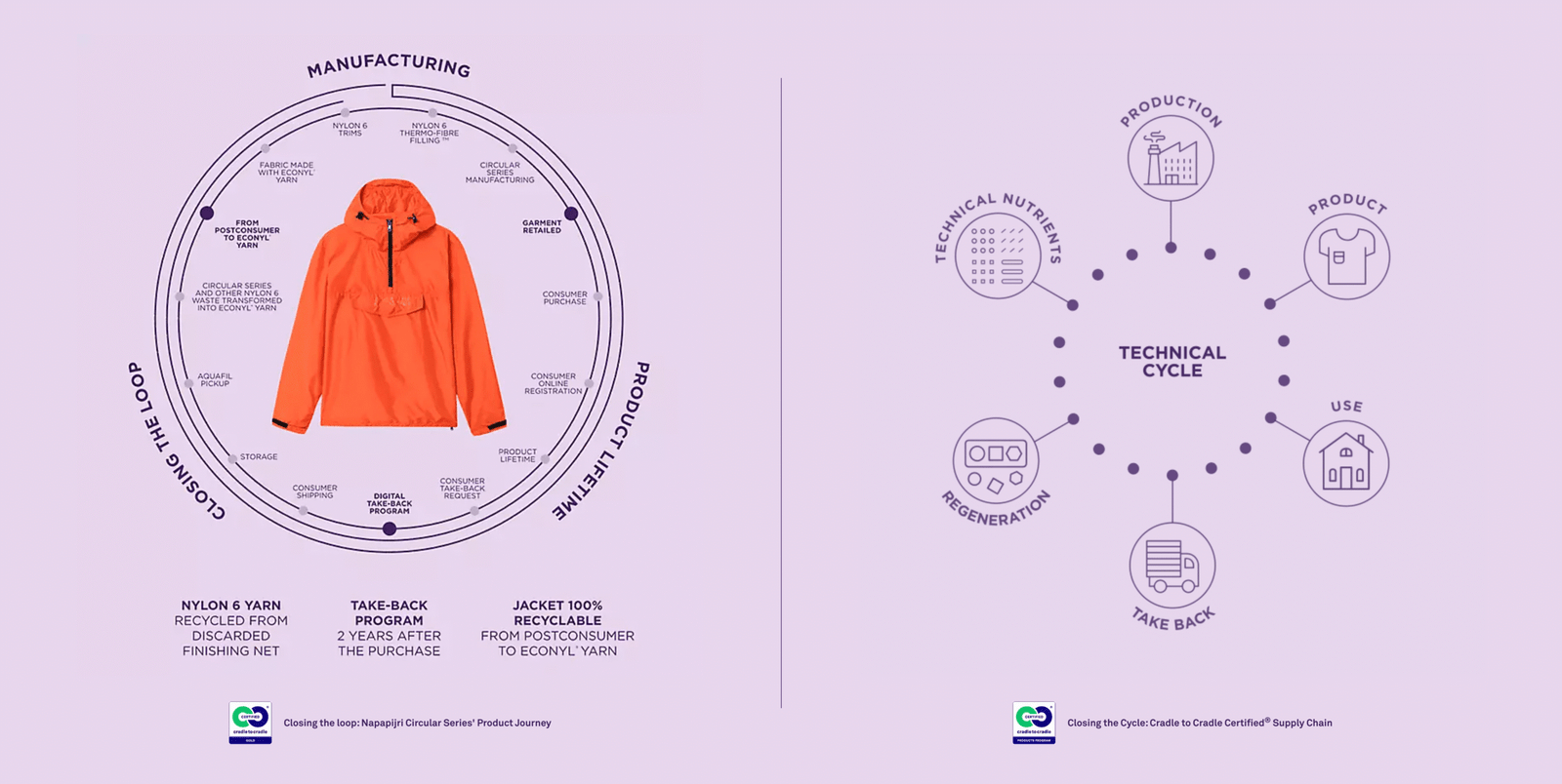 Napapijri 的循环系列竭力实现产品安全及循环性,为人类及地球带来正面的影响,他们的付出获得了 Cradle to Cradle Certified® Gold 认证的肯定。